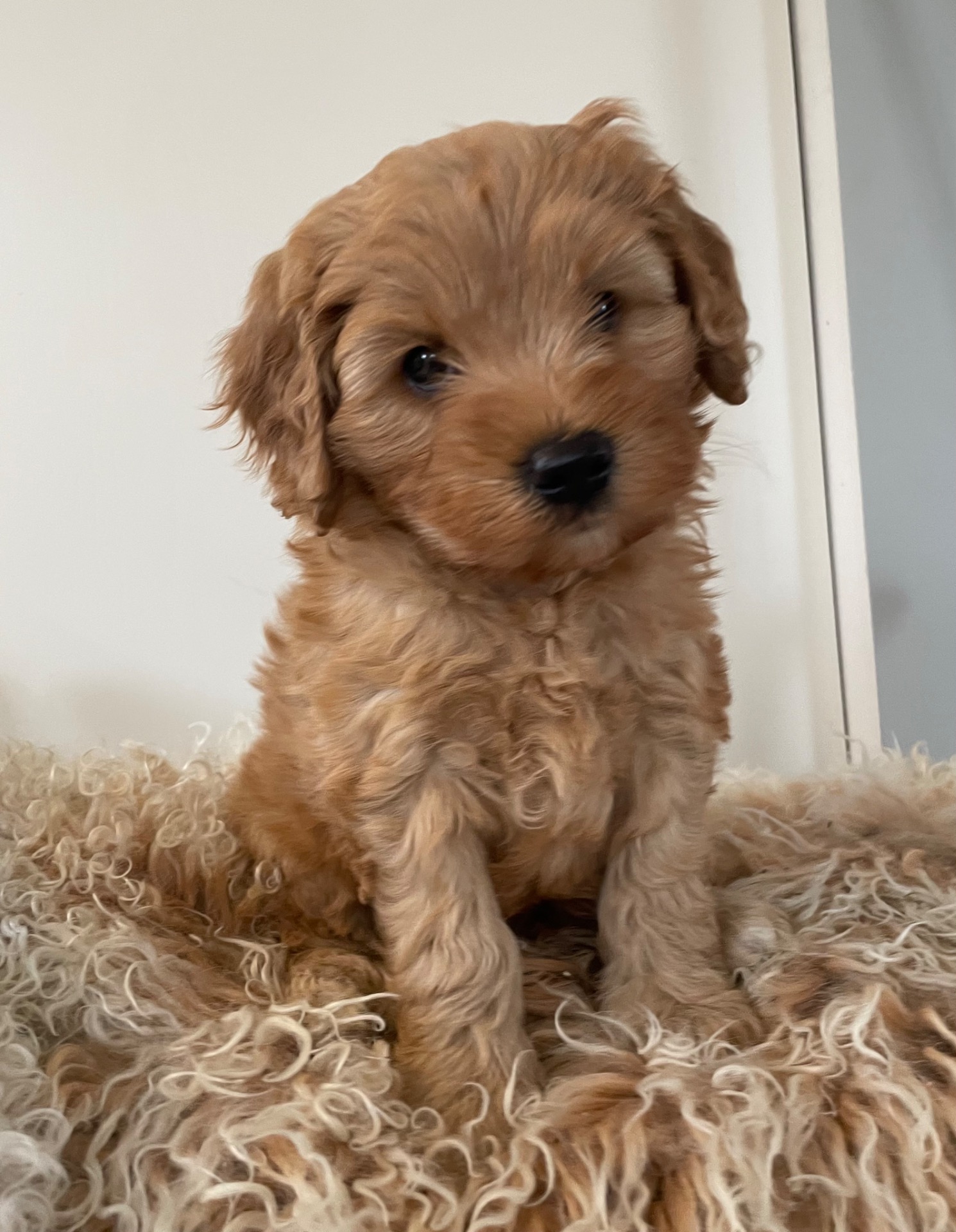 Vi har en obokad underbar liten kille som heter Morris. Han blir 8 veckor gammal den 27 mars. Han är minst i kullen och beräknas bli antingen en miniatyr eller liten medium australian labradoodle. Han har en underbar röd/aprikos färg och fleecepäls.